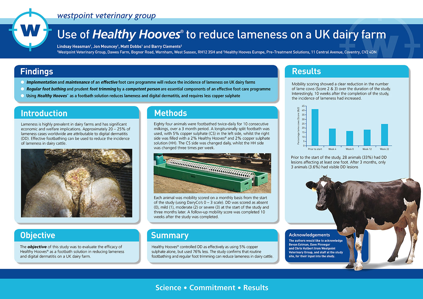 The objective of the study was to compare the effectiveness of using Healthy Hooves® and 2% copper sulphate as a footbath solution, compared with normal farm practice of using a 5% copper sulphate solution, on the incidence and severity of lameness in dairy cattle, and in particular on Papillomatous Digital Dermatitis (PDD).